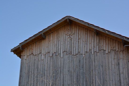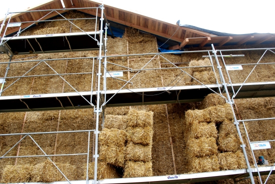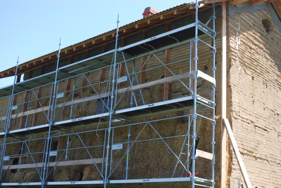 Rénovation d'un mas dauphinois en pierre et pisé. La charpente d'origine a été entièrement déposée et reconstruite en douglas suite à la reprise des murs par un maçon. L'isolation a été réalisé en paille, à plat dans les combles. Le mur Nord a quant à lui été doublé par l'extérieur par une isolation paille, recouverte d'un bardage douglas brut, non raboté à couvre joints :