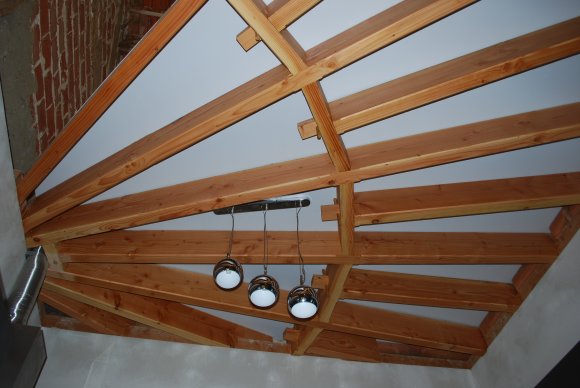Une partie du solivage de la maison a également été repris. Le choix a été fait de poser un solivage rayonnant, permettant de laisser passer de la lumière de l'étage tout en ayant un rendu esthétique. Le bois utilisé est du douglas.